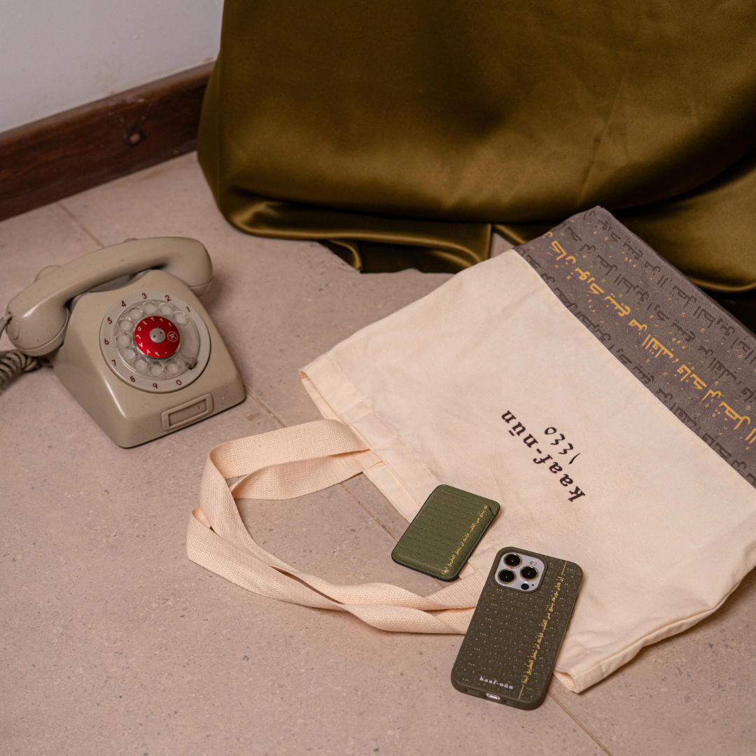 Infused with spiritual elegance, this green bag features a beautifully scripted line of Rumi’s poetry: "إن كان نورك ينبع من القلب، فإنك لن تضل الطريق أبدًا" ("If your light comes from the heart, you will never lose your way"). Set against a deep green backdrop symbolizing growth and serenity, the golden Arabic calligraphy reflects the centuries old wisdom.