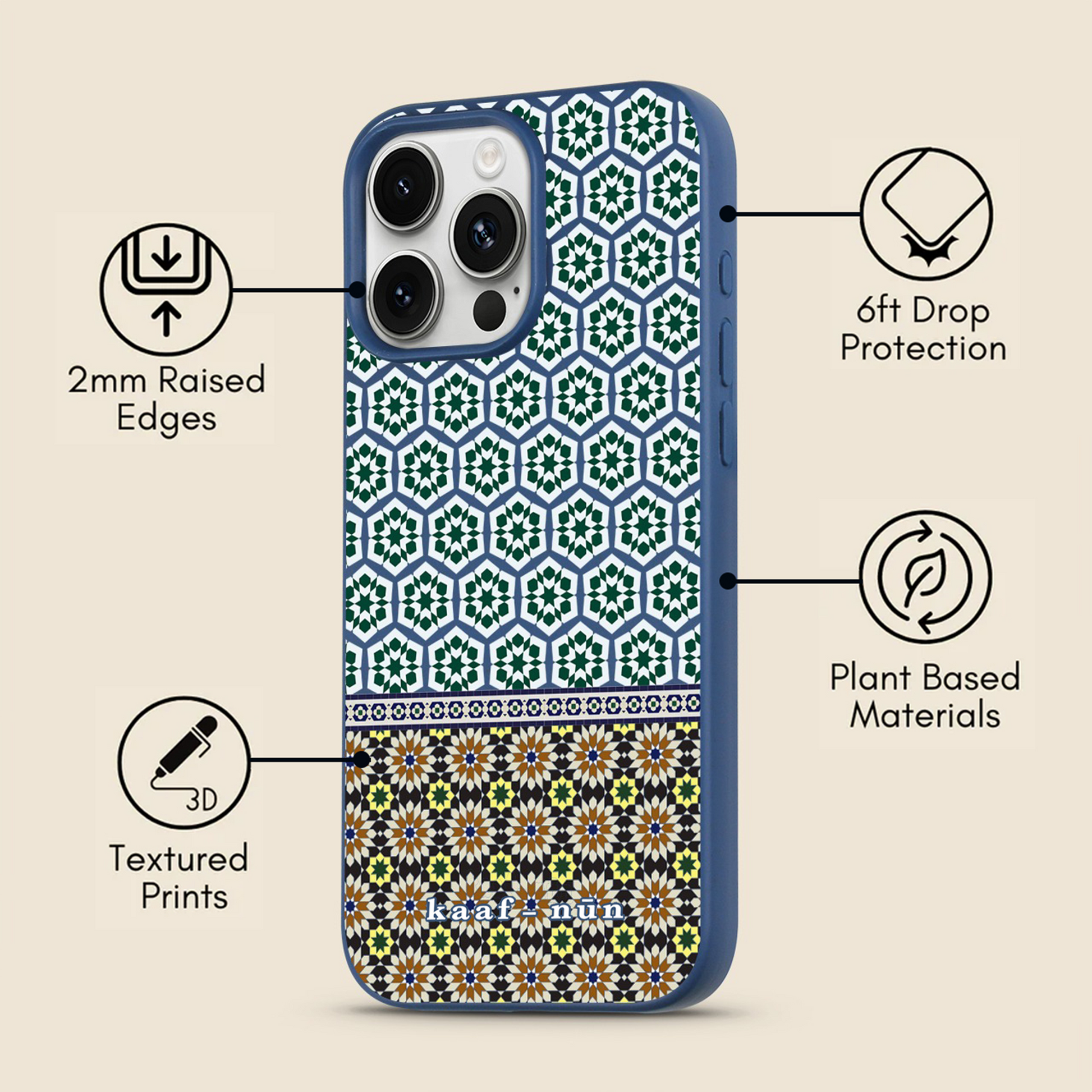 I’d highly recommend this case. As a (half) Moroccan, I smile every time I see zellige patterns so the case makes me very happy! It is also super robust (esp compared to my old case) with a larger ‘lip’ around the sides which makes it really safe. Will buy again! (Would love a ‘stars/flower based’ zellige case in fully blue shades!)
